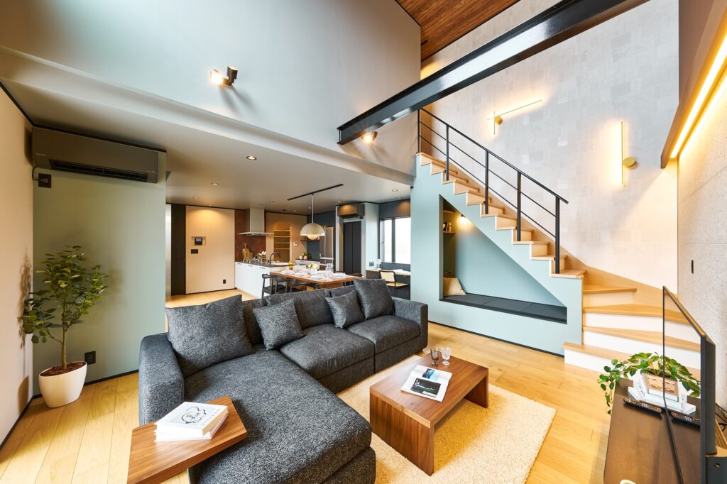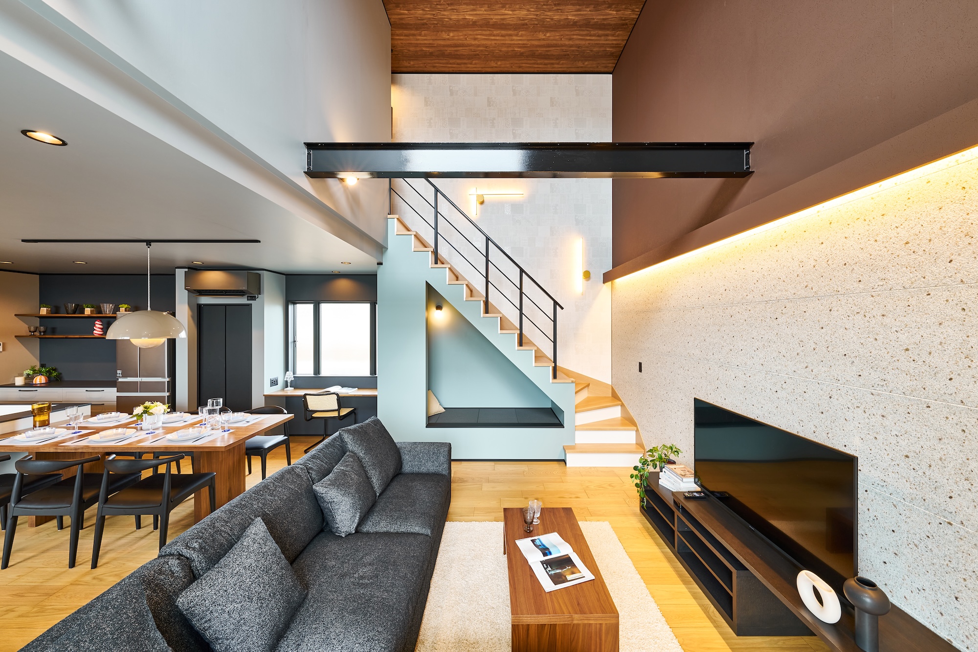 陽光が降り注ぐ開放的な吹き抜けリビングは、家族が自然に集まり、みんなでくつろげる居心地の良い空間です。