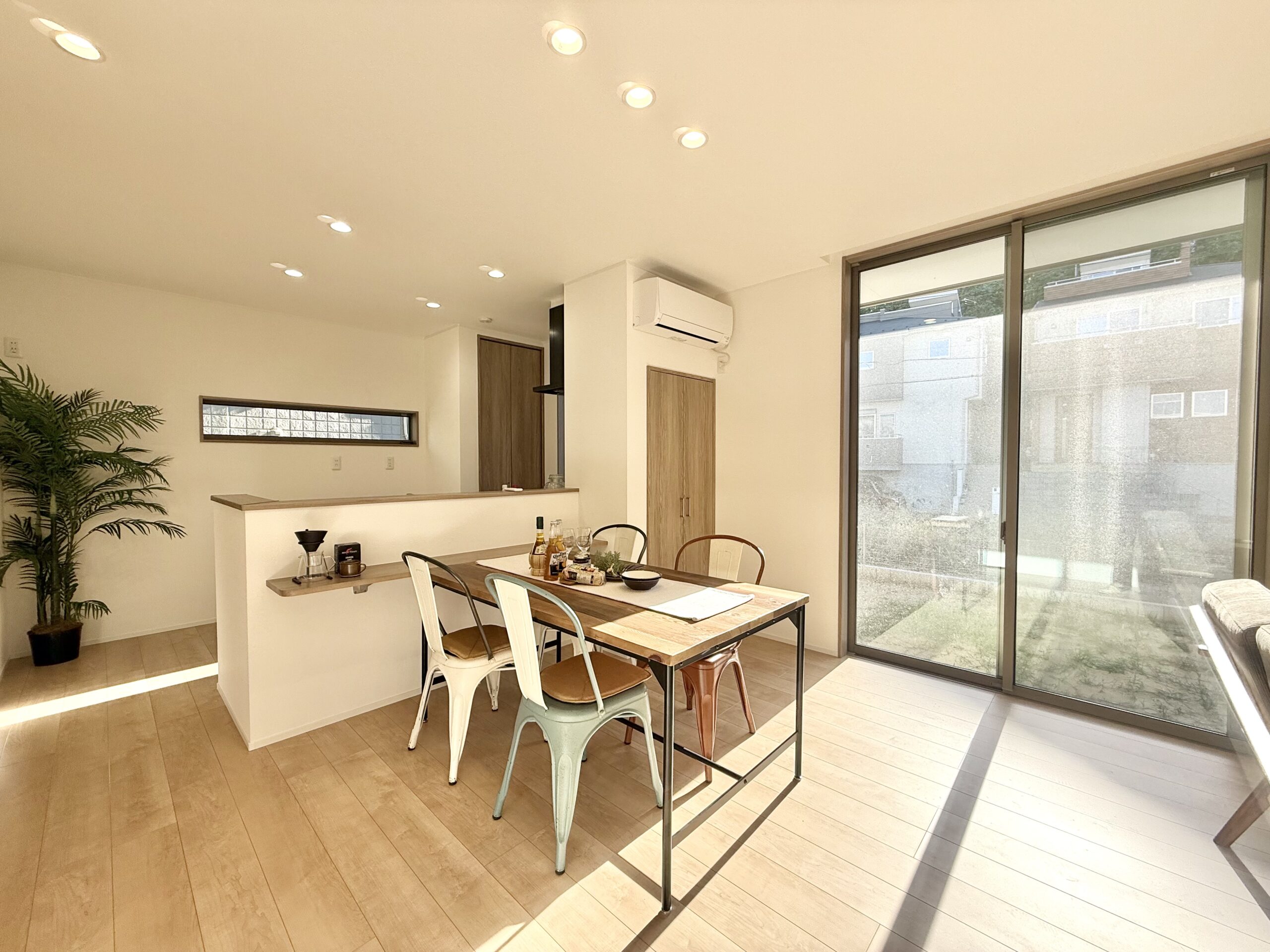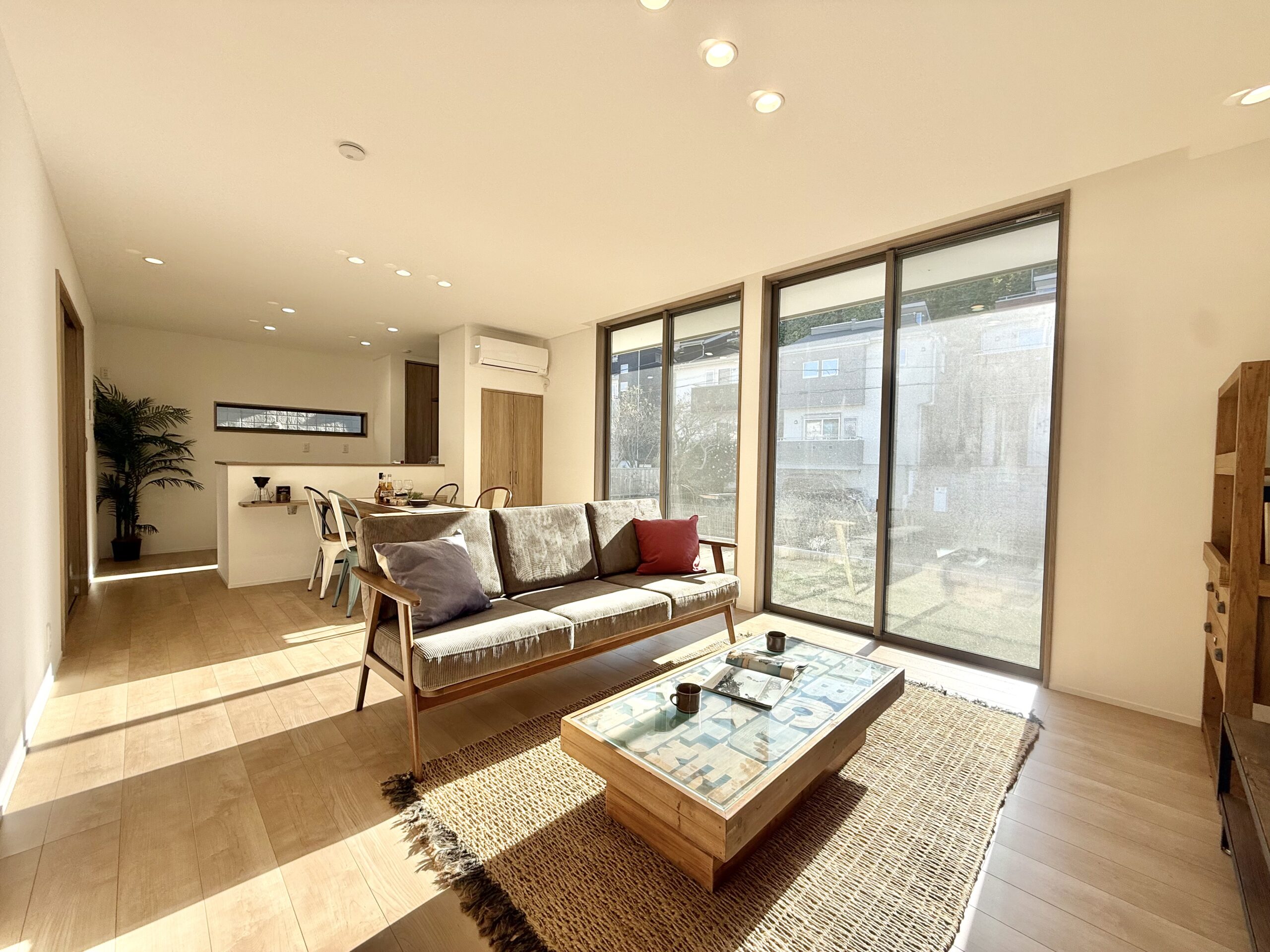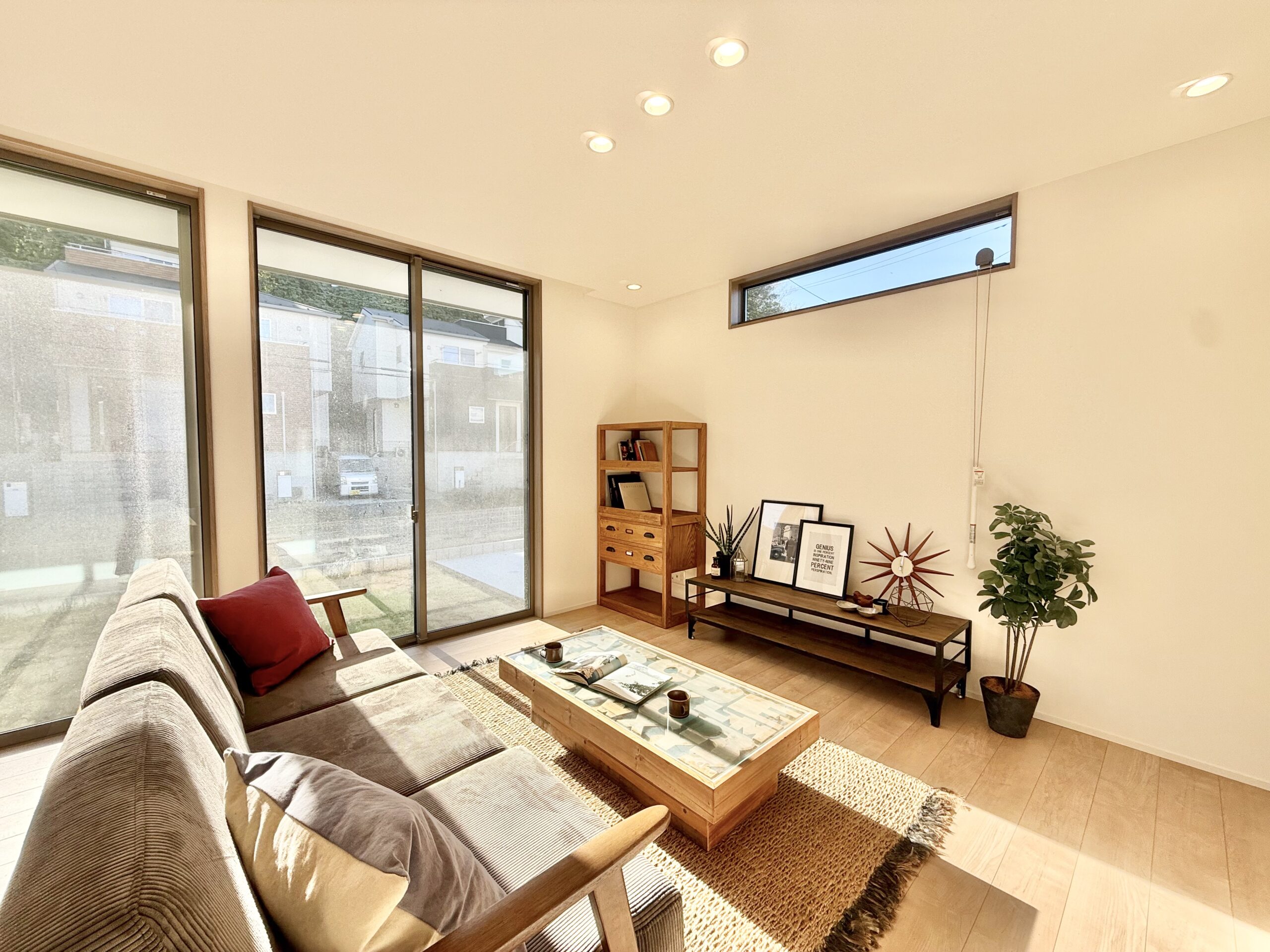 天井まで伸びたハイサッシから陽光が降り注ぐ、開放感と温もりに包まれた住まいです。