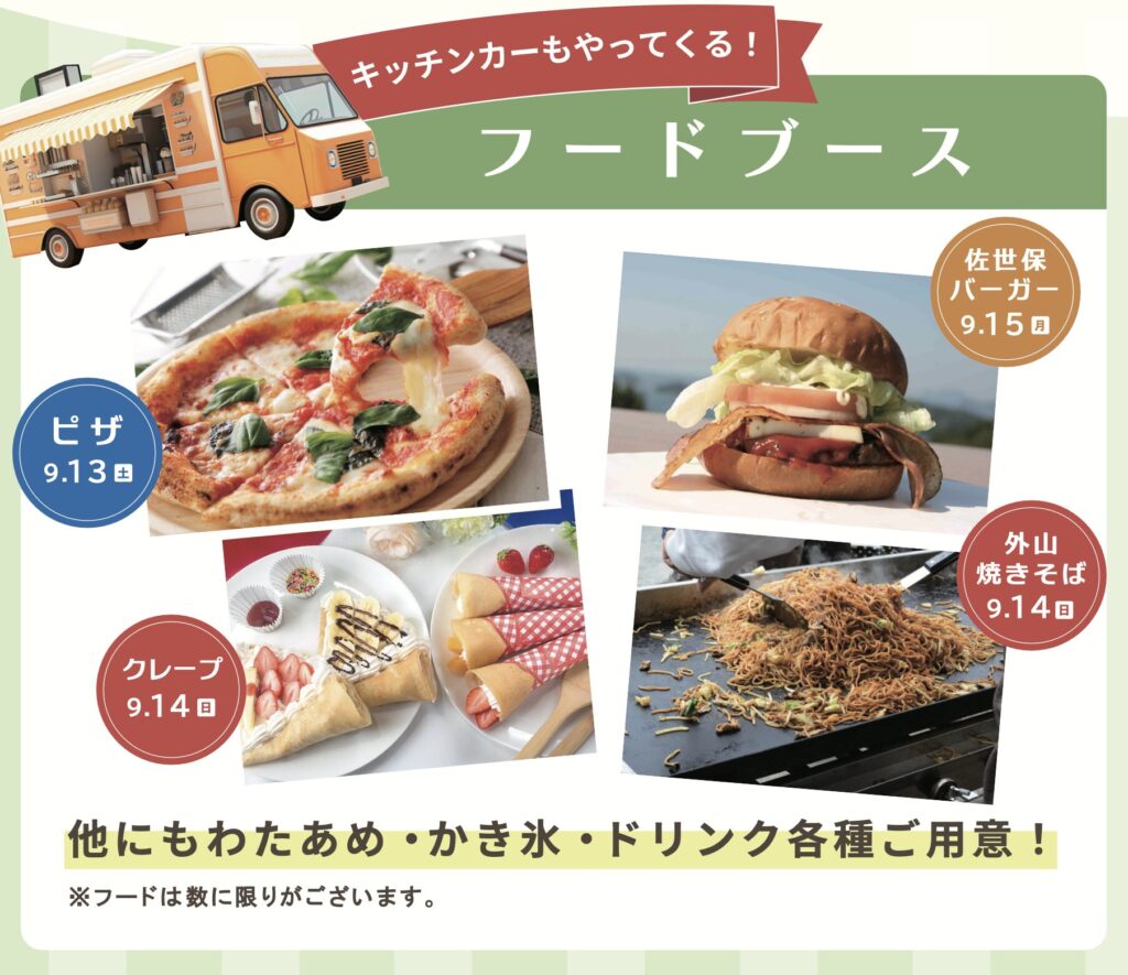 フードコーナーでは、ピザやクレープ、佐世保バーガーなどの日替わりメニューに加えて、わたあめ・かき氷・ドリンク各種を無料でご提供します。ご家族みなさまでお楽しみいただけます♪
