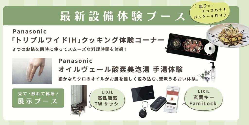 最新設備体験ブースでは、Panasonic「トリプルワイドIH」やPanasonic「オイルヴェール酸素美泡湯」、LIXIL「高性能窓TWサッシ」、LIXIL「玄関キー FamiLock」などの最新住宅設備を実際に見て・触れて、使い心地をご体感いただけます♪