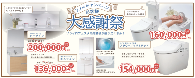 お客様大感謝祭として、水まわり設備の「ソライロフェスタ限定特価」も盛りだくさんです!