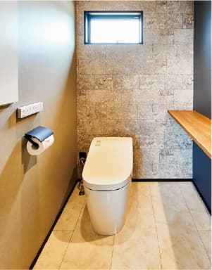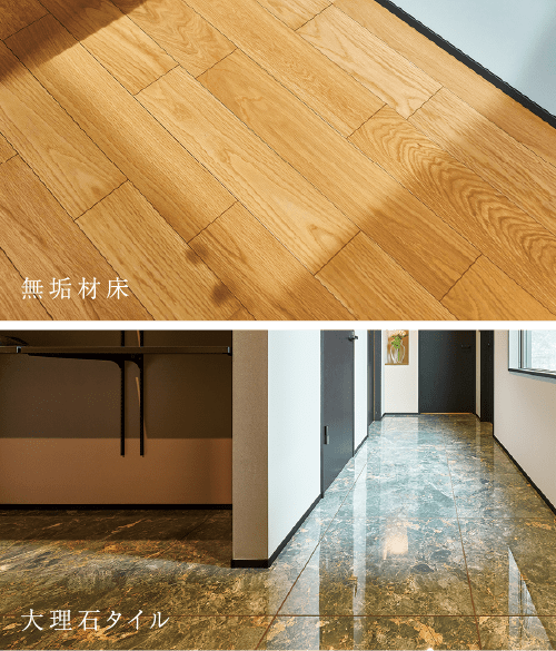 足元に広がる無垢材の温もりと大理石タイルの気品が、室内に豊かな表情を生み出します。